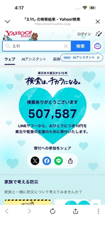 皆さんこんばんは 遯∫┯縺ァ縺吶′逧&繧薙縺薙譎よ悄縺ォ縺ェ繧九→Yahoo縺ァ縺ァ縺阪k縺薙→縺後≠繧九%縺ィ繧偵#蟄倡衍縺ァ縺励g縺°? それは、Yahooにて3.11と検索すると10円が東北や能登に寄付される機能です。 とは言っても自分たちの残高とかが減ったり有料っていうわけではないのです。 検索するだけで誰かの役に立てるというわけです。 私はこういうのはやらない善よりやる偽善だと思っています