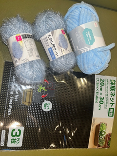 編み付けネットというお裁縫にハマってます🩵 つぎは何を作ろうかなと考え中🧶 材料はこちら💁♀️ モコモコとキラキラをMIXして なにかを作りたいけど アイデアが浮かばない😂 芸術家としての才能が、、笑