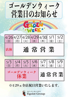 こんばんは!りんです( •̀ᴗ•́ ) 昨日も沢山のご来店ありがとうございました😳✨ GWは写真の通りの営業となります! 明日は祝日ですが浅草橋店営業しますよー😉 今日も浅草橋EGOISTでお待ちしております🍻