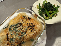 グラタン失敗した!!コンソメなくてダシダ足したらいつも作ってるグラタンじゃなくなった!あんまり美味しくない🥲学び、学び🥹人間はこうして学んでいくのですねあとやっぱりオーブン時間かかるからグリルで焼いたら変に焦げた🥹せっかちすぎるのもよくないです
