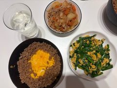 わーい‼︎ さんですっ‼︎ 昨日は 一日中お休みで お友達が お家に遊びに来たので 料理しました~😽 やっぱり料理するの好きだから 久しぶりにできて 幸せでした😖💖 そぼろたまご丼と ニラ玉と 肉じゃがでっす!! 最高に美味しかった🥹 さんちゃんの手料理食べたい人~?🥹