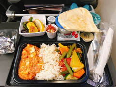 SQの機内食はなんでこんなに美味しいのだろうか 1食目はヴィーガン!!! 一般食だとビーフシチューかチキングリルだった ナンが付いてるのレアって記事で読んでたから 嬉しかった😮💨🩶 21時からお店開いてます! エデンでお待ちしてます!