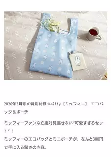 かわよ〜〜〜ひな氏ミッフィーちゃん好きなんよね昨日お店の女の子がこれ教えてくれてさ可愛い〜〜雑誌の付録にミッフィーちゃんのエコバッグ買いますゼクシィ過去にも何度か付録目当てに買おうとしたことあったけど、なんか照れくさくて踏みとどまっちゃったのよね今のひな氏は止まらねえついにゼクシィデビューします