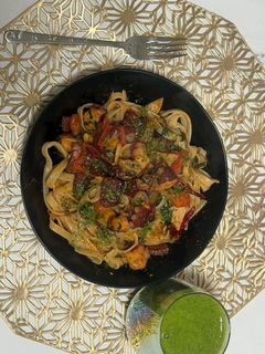 腸内環境を整えるウィーク アーモンドミルク(砂糖不使用 ほうれん草とばななのスムージー つくったよ✿︎ パスタは玄米パスタでタコ、トマト、大葉のペペロンチーノ