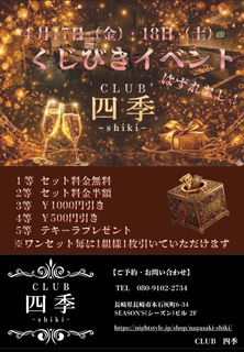 こんばんは!🌙*゜ 週真ん中あとちょっとー!♡ 今週は四季イベントもあるしあと半月でゴールデンウィークだし!😊楽しみいっぱいでワクワクしてます(*^^*) 四季のイベントくじ引きなんですけど、なんと(@_@;) 1等は、、、 1セット無料❤︎ワンセットごとにくじ引き1回できるので今月の運試しにいかがですか?✩⡱ 今日も元気にオープンしてますのでぜひご来店下さい(💪・▷・) CLUB四季21:00~OPENです!